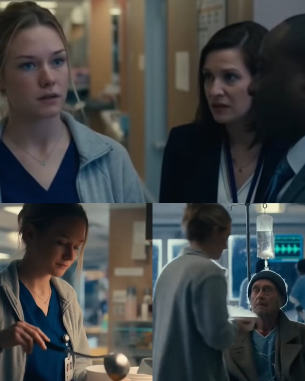 Setting: St. Jude’s Waiting Room / The Sidewalk. Plot: Claire returns to the hospital, not in scrubs, but in civilian clothes. She meets Sarah (the journalist). They arrive just as security is wheeling Elias (in a wheelchair, looking confused and frail) toward the exit doors. Conflict: Claire physically blocks the wheelchair. Frank (the guard) is torn between duty and morality. Sarah films the entire interaction. Claire creates a scene, demanding to know where Elias is going. Key Moment: A bystander recognizes Claire from the viral post and starts livestreaming. The hospital administrator (Halloway) comes out, threatening to call the police for trespassing.